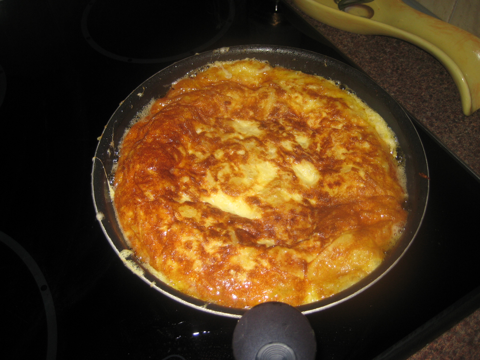 Now slide back gently the tortilla into the pan cooked side up.